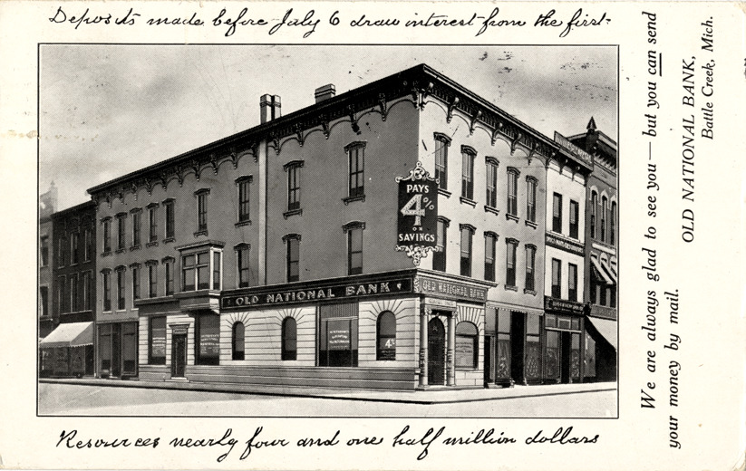View of the Old National Bank in Battle Creek, Michigan. Printed on front: "We are always glad to see you, but you can send your money by mail. Old National Bank, Battle Creek, Mich. Deposits made before July 6 draw interest from the first. Resources nearly four and one half million dollars." Printed on back: "Last March you no doubt received my current invitation to entrust your savings and do your other business at the reliable Old National Bank. If you did so you have proved its sure confidential character and are satisfied that no Paul Pry can gratify his morbid curiosity regarding your affairs. Your interest is compounded quarterly and 4% per annum and your account is valued. Charles Austin, Vice Pres." Card is postmarked 1912.