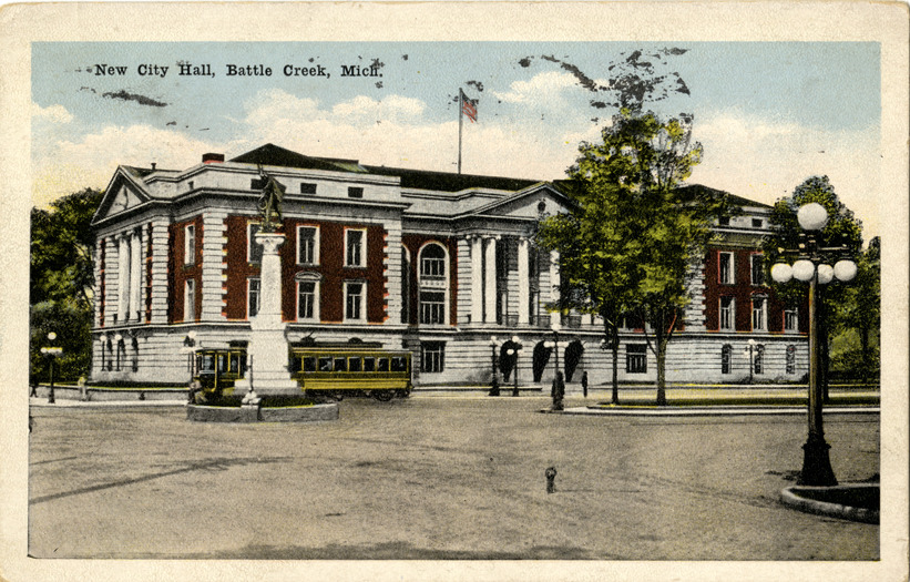 View of the City Hall in Battle Creek, Michigan. Printed on front: "New City Hall, Battle Creek, Mich." Printed on back: "E.C. Kropp Co., Milwaukee." Handwritten on back: "Rec'd letter and glad to hear. Saw F. Sat. evening for a minute. There's a house full of company here. Four besides Marian & I. F. seemed to like the work and all but was awfully tired. Will try to see him again soon & he has written I'm sure. Love, [undecipherable]." Card is postmarked September 10, 1917.