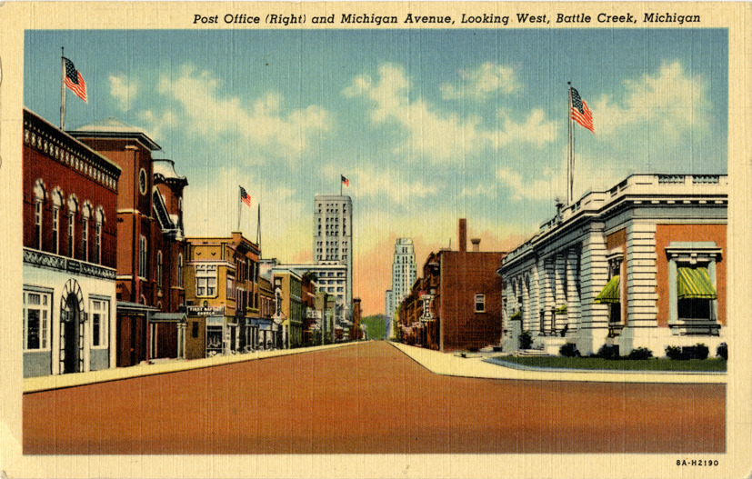 View of U.S. Post Office and other buildings on Michigan Ave. in Battle Creek, Michigan. Printed on front: "Post Office (right) and Michigan Avenue, looking west, Battle Creek, Michigan." Printed on back: "Battle Creek News Co. Genuine Curteich-Chicago 'C.T. Art-Colortone' post card (reg. U.S. Pat. Off.)"