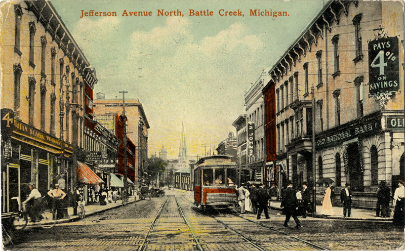 View of streetcar and commercial buildings on Jefferson Ave. in Battle Creek, Michigan. Printed on front: "Jefferson Avenue North, Battle Creek, Mich." Handwritten on back: "Battle Creek. Aug. 18th. Dearist [sic] Ethel, How are you hope you are enjoying yourself. I have been sick today did not work. Disappointed today I didn't hear from you dear. How is everything in Bellevue. You know. Bye bye, yours, Pearl. xxxxx." Card is postmarked August 18, 1910.