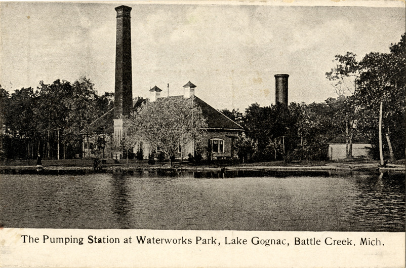 View of the pumping station at Waterworks Park on Lake Goguac in Battle Creek, Michigan. Printed on front: "The pumping station at Waterworks Park, Lake Gognac [sic], Battle Creek, Mich."