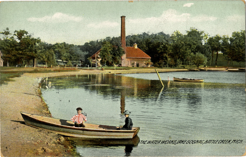 View of the pumping station at Waterworks Park on Lake Goguac in Battle Creek, Michigan. Rowboat in foreground. Printed on front: "The waterworks, Lake Gognac [sic], Battle Creek, Mich." Printed on back: "The Rotograph Co., N.Y. City. Printed in Germany."