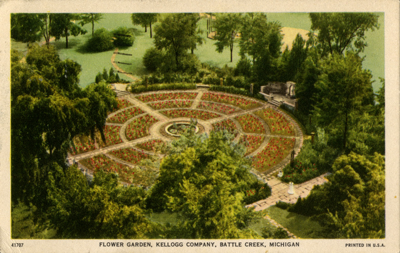 Bird's-eye view of circular flower garden at the Kellogg Company in Battle Creek, Michigan. Printed on front: "Flower garden, Kellogg Company, Battle Creek, Michigan. Printed in U.S.A." Printed on back: "Flower garden, Kellogg Company, Battle Creek, Michigan. The Kellogg flower garden attracts thousands of visitors when in bloom. It is a part of the 13 acre landscaped employee recreation park with its swimming pools and athletic field. Say 'Kellogg's' before you say corn flakes." Handwritten on back: "Hi Crissa, We just finished a tour of the plant. It's very interesting. Write how & when you are coming. We are looking for you. Louise." Card is postmarked August 18, 1941.