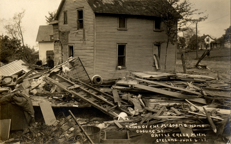 View of the McCoomb residence on Goguac Street damaged by tornado in Battle Creek, Michigan. Pile of debris is in front of wooden-frame house. Printed on front: "Ruins of the McCoomb home on Goguac St., Battle Creek, Mich. cyclone, June 6, 17."
