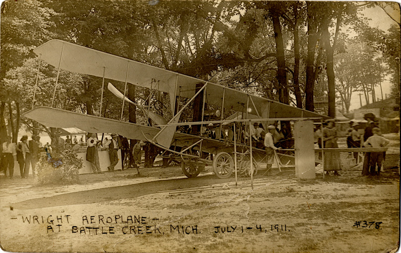 Favorite this☆ Wright airplane at Battle Creek, Michigan Description: View of spectators surrounding a Wright airplane at Battle Creek, Michigan. Printed on front: "Wright aeroplane at Battle Creek, Mich. July 1-4, 1911." Details Resource ID: bh011514 Subject: Airplanes--Michigan--Battle Creek Photographic prints Postcards Date Issued: 1911-07 Format: 1 postcard ; 3.5 x 5.5 in. Member of: Burton Historical Collection Filing Location: M/Localities-Battle Creek Rights: Physical rights are retained by DPL. Copyright is retained in accordance with U.S. copyright laws.