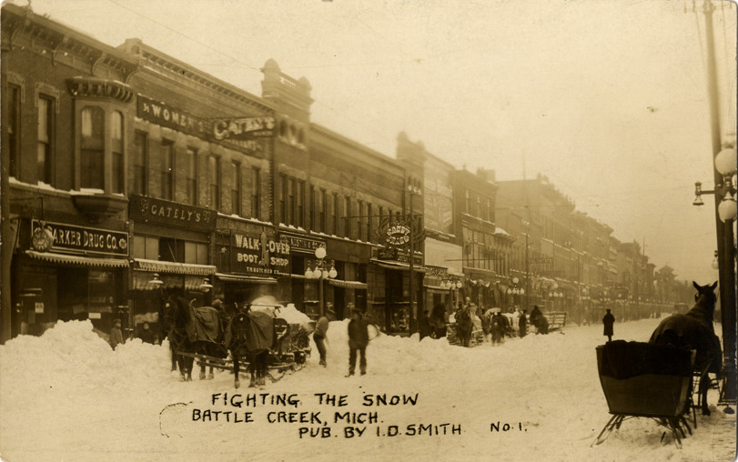 View of horse-drawn sleds and sleighs on snow-covered street in Battle Creek, Michigan. Commercial buildings in background. Printed on front: "Fighting the snow. Battle Creek, Mich. Pub. by I.D. Smith, no. 1."