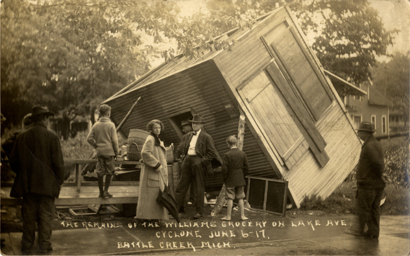 View of onlookers with Williams grocery store on Lake Avenue damaged by tornado in Battle Creek, Michigan. Wooden-frame building is overturned. Printed on front: "The remains of the Williams grocery on Lake Ave. Cyclone, June 6-17. Battle Creek, Mich."