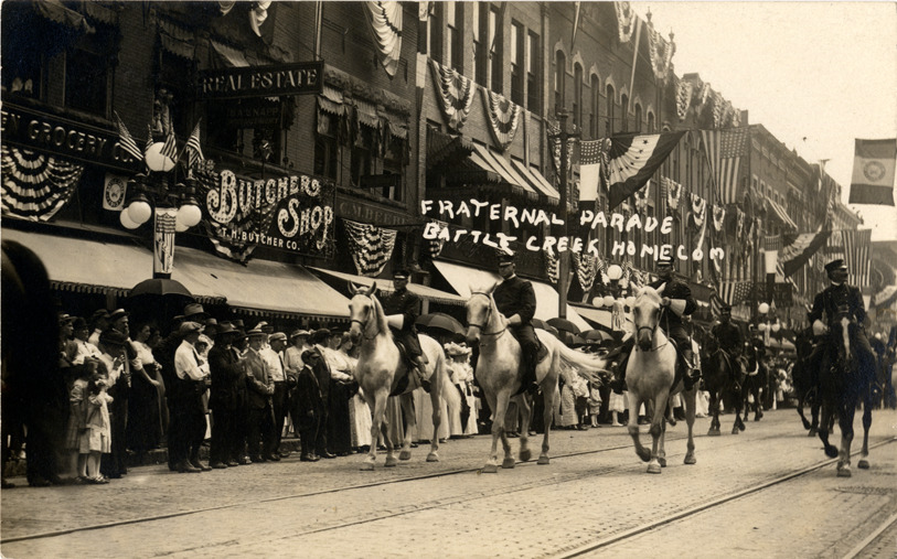 View of uniformed men on horseback in fraternal parade in Battle Creek, Michigan. Spectators and commercial buildings in background. Printed on front: "Fraternal parade, Battle Creek homecom."