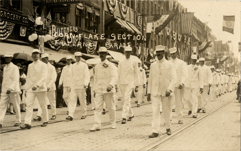 View of men, wearing white uniforms and hats, marching in fraternal parade at Battle Creek, Michigan. Spectators and commercial buildings in background. Printed on front: "Corn Flake section, fraternal parade."