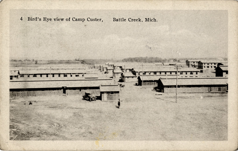 View of Camp Custer in Battle Creek, Michigan. Printed on front: "4. Bird's-eye view of Camp Custer, Battle Creek, Mich." Printed on back: "Pub. by Harry H. Hamm, Toledo, Ohio.."