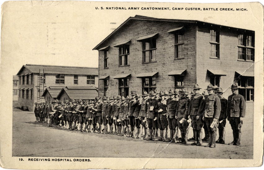 View of soldiers receiving hospital orders at Camp Custer in Battle Creek, Michigan. Printed on front: "U.S. National Army cantonment, Camp Custer, Battle Creek, Mich. 19. Receiving hospital orders." Printed on back: "Published by Harry H. Hamm, Toledo, Ohio. Made in U.S.A." Handwritten on back: "Dear Sister, How are you all. I am planning on coming home Sun. Perhaps you can get over. Had quite a snow storm here last night. Ben." Card is postmarked November 28, 1917.