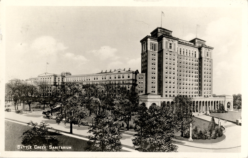View of the Battle Creek Sanitarium in Battle Creek, Michigan. Printed on front: "Battle Creek Sanitarium." Handwritten on back: "Feb. 22. Dear Zella, Going home today feeling fine. Will write you later. Love, Clara." Card is postmarked February 25, 1934.