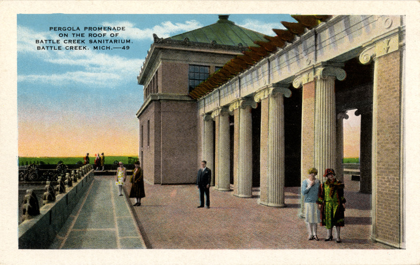 View of men and women on the rooftop pergola promenade at the Battle Creek Sanitarium in Battle Creek, Michigan. Printed on front: "Pergola promenade on the roof of Battle Creek Sanitarium. Battle Creek, Mich. 49." Printed on back: "The pergola promenade on the roof permits enjoyment of cool breezes from the inland lakes and a view of indescribable beauty, especially the well-kept farm lands and the winding roads which are visible for many miles in all directions. Made in U.S.A. by E.C. Kropp Co., Milwaukee."
