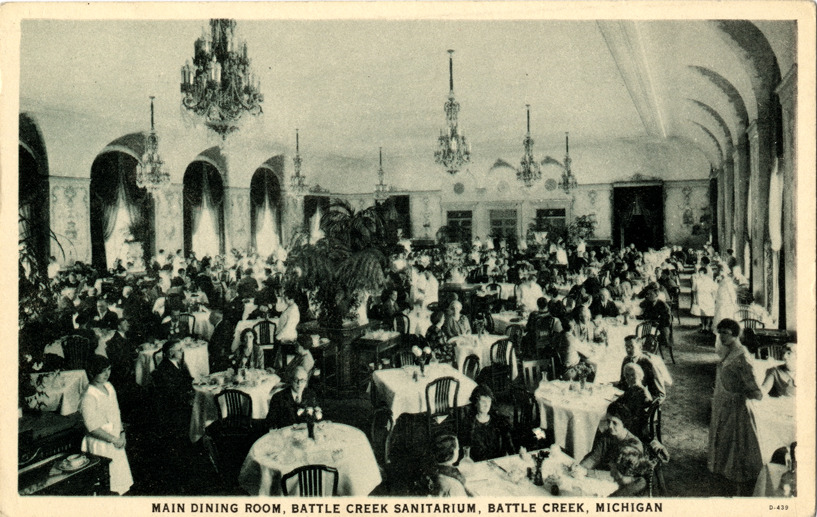 View of men and women in the main dining room at the Battle Creek Sanitarium in Battle Creek, Michigan. Room is furnished with chairs and cloth-covered tables. Chandeliers are suspended from ceiling. Printed on front: "Main dining room. Battle Creek Sanitarium, Battle Creek, Michigan." Printed on back: "Section of the main dining room at Battle Creek Sanitarium. It provides accommodations for 1,000 guests. Here are served foods to meet the individual dietary needs of each guest. Made by Curt Teich & Company, Inc., Chicago, U.S.A."