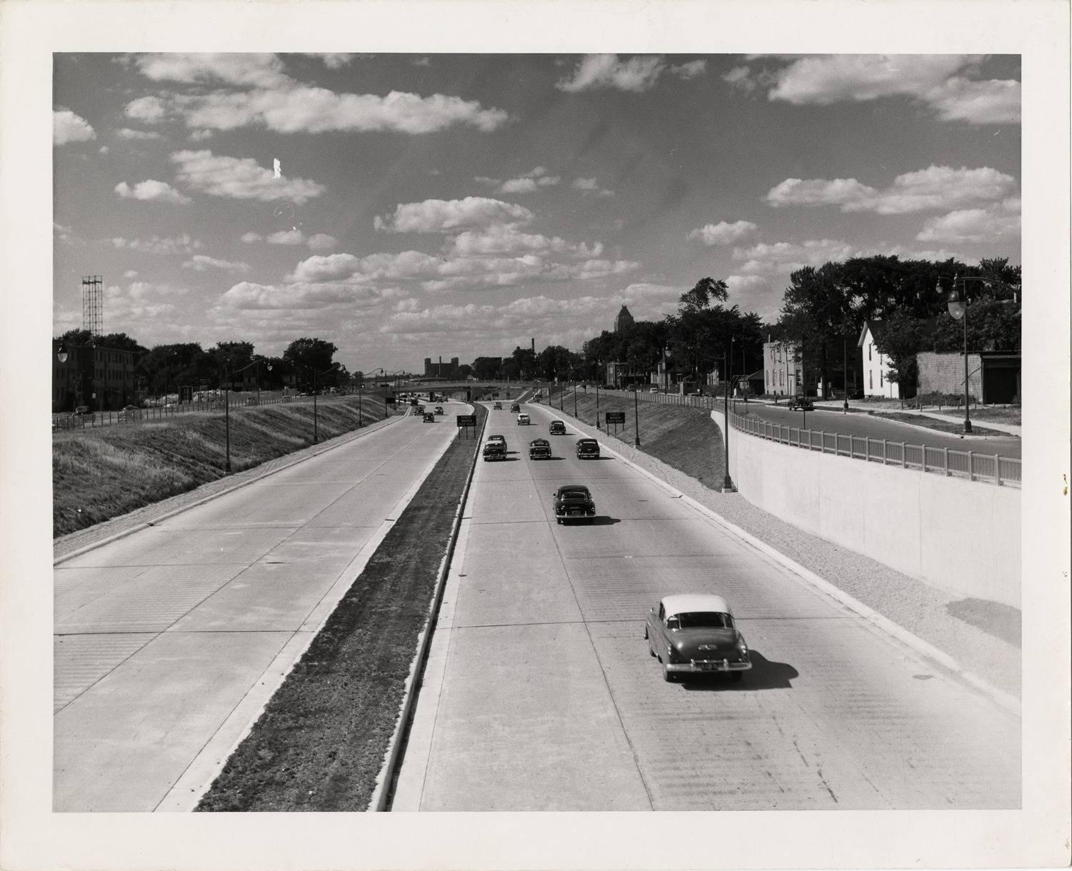 View of cars on the John C. Lodge Expressway in Detroit, Michigan as viewed from the Selden pedestrian bridge. Stamped and handwritten on back: "Print furnished by Michigan State Highway Department. Charles M. Ziegler, State Highway Commissioner. Subject: Lodge Expressway from Seldon [sic] pedestrian bridge, south & north. Date picture taken: 7-23-53."