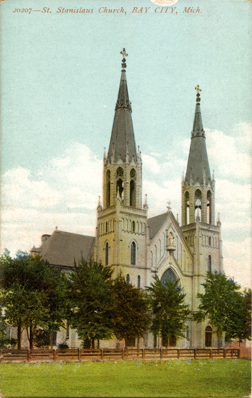 Favorite this☆ St. Stanislaus Church, Bay City, Michigan Description: View of St. Stanislaus Church in Bay City, Michigan. Printed on front: "20207. St. Stanislaus Church, Bay City, Mich." Printed on back: "Souvenir Post Card Co., New York. Printed in Germany." Details Resource ID: bh011664 Subject: Catholic church buildings--Michigan--Bay City Postcards Publisher: Souvenir Post Card Co. Date Issued: Unknown year Format: 1 postcard : col. ; 5.5 x 3.5 in. Member of: Burton Historical Collection Filing Location: M/Localities-Bay City Rights: Physical rights are retained by DPL. Copyright is retained in accordance with U.S. copyright laws.