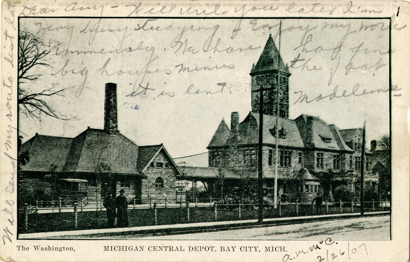 View of the Michigan Central Railroad station in Bay City, Michigan. Printed on front: "Michigan Central depot, Bay City, Mich. The Washington." Handwritten on front: "Dear Amy, Will write you later I'm very busy studying. Enjoy my work immensely. We have had fine big houses minus the fact it is [undecipherable]. Will send my route list later. Madeleine. A.M.M.C. 2/26/07."