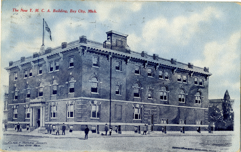 View of the Y.M.C.A. building in Bay City, Michigan. Printed on front: "The new Y.M.C.A. building, Bay City, Mich. Clark & Muncer Archts, Bay City, Mich." Printed on back: "Tom Jones, Cincinnati, O." Handwritten on back: "We arrived home OK on time and found all well and everything in good shape. As ever your boy, Arthur J." Card is postmarked November 16, 1907.