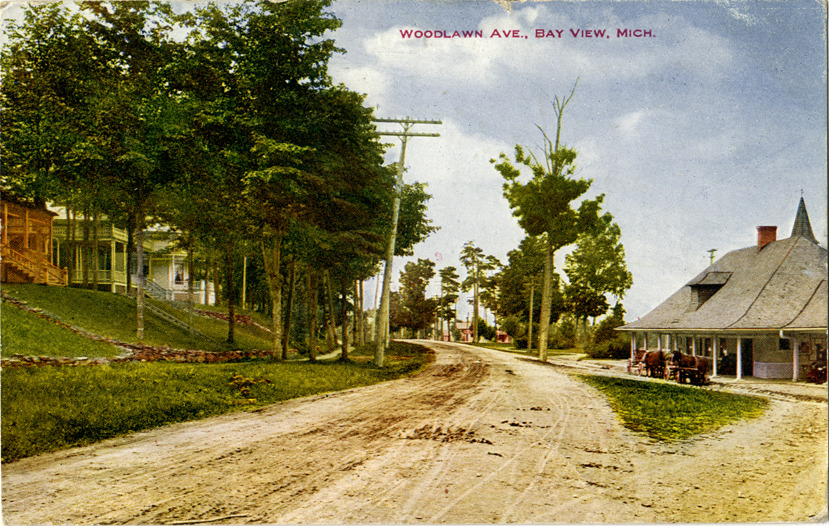 View of houses and an unidentified building on Woodlawn Ave. in Bay View, Michigan. Printed on front: "Woodlawn Ave., Bay View, Mich." Printed on back: "No. 2127. V.O. Hammon Pub. Co., Chicago." Handwritten on back: "Petoskey, Mich. Aug. 23. Dear Cora, Well we are here where you wanted to be, its beautiful. Wear [sic] enjoying it to the limit. Going to Mackinac tomorrow. So many things [undecipherable] don't know where to go first. Expect you have been seeing, too. Martha." Card is postmarked August 24, 1910.