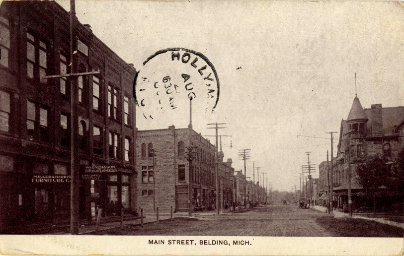 View of commercial buildings on Main St. in Belding, Michigan. Printed on front: "Main Street, Belding, Mich." Handwritten on back: "Dear Grandma & all, Here we are and having a fine time. Just started for Greenvill [sic] my what good times we are having a fine time. Love to all, Anna & Homer." Card is postmarked August 3, 1909.