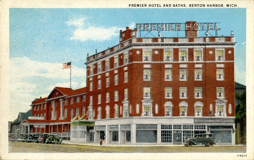 Favorite this☆ Premier Hotel and Baths, Benton Harbor, Michigan Description: View of the Premier Hotel and Baths in Benton Harbor, Michigan. Printed on front: "Premier Hotel and Baths, Benton Harbor, Mich." Printed on back: "C.T. American Art Colored." Details Resource ID: bh011769 Subject: Hotels--Michigan--Benton Harbor Postcards Publisher: Curt Teich & Co. Date Issued: Unknown year Format: 1 postcard : col. ; 3.5 x 5.5 in. Member of: Burton Historical Collection Filing Location: M/Localities-Benton Harbor Rights: Physical rights are retained by DPL. Copyright is retained in accordance with U.S. copyright laws.
