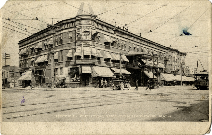 View of the Hotel Benton in Benton Harbor, Michigan. Printed on front: "Hotel Benton, Benton Harbor, Mich. Louis A. Jerue" Handwritten on back: "Mery [sic] Chistmas [sic] & Happy New Year. From friend Lottie [undecipherable]." Card is postmarked December 30, 1907.