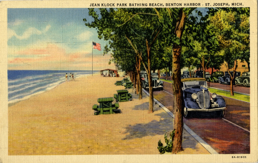View of the Jean Klock Park and Bathing Beach in Benton Harbor, Michigan. Cars are parked along road. Printed on front: "Jean Klock Park Bathing Beach, Benton Harbor, St. Joseph, Mich." Printed on back: "Twin City News Agency, Benton Harbor, St. Joseph, Mich. 'C.T. Art-Colortone' post card. Reg. U.S. Pat. Off. Made only by Curt Teich & Co., Inc., Chicago." Handwritten on back: "Dear Friend, Great convention. Returning Sat. am. Dr. Reitch." Card is postmarked June 23, 1938.