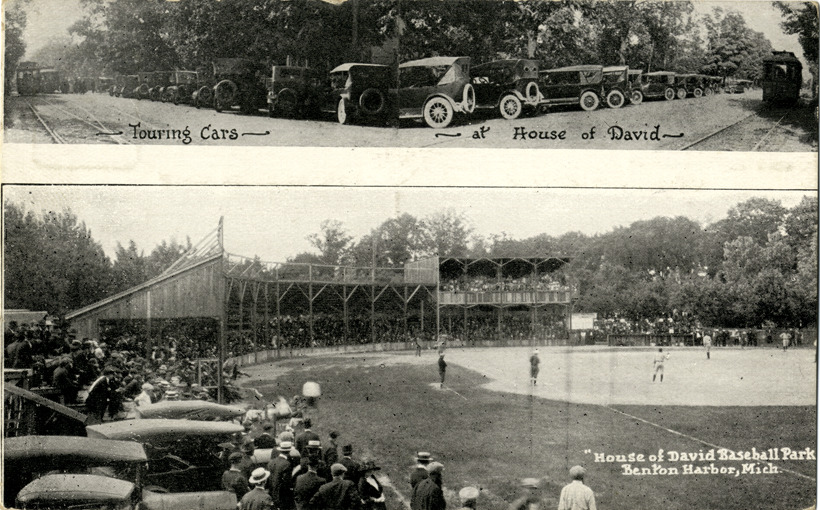 Individual views of spectators watching a baseball game at the House of David ballpark in Benton Harbor, Michigan and cars parked along road at the house of David. Printed on front: "Touring cars at House of David; House of David, baseball park, Benton Harbor, Mich." Printed on back: "Eden Springs, House of David, Benton Harbor, Mich. U.S.A. Send for literature."