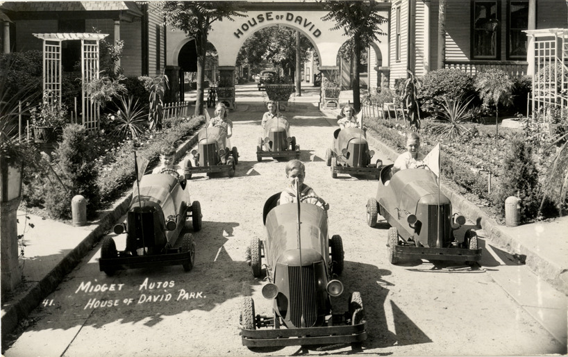 View of children posing in miniature racecars at the House of David Park in Benton Harbor, Michigan. Printed on front: "Midget autos, House of David Park." Printed on back: "Eden Springs, House of David, P.O. Box 477, Benton Harbor, Mich. U.S.A. Send for literature."