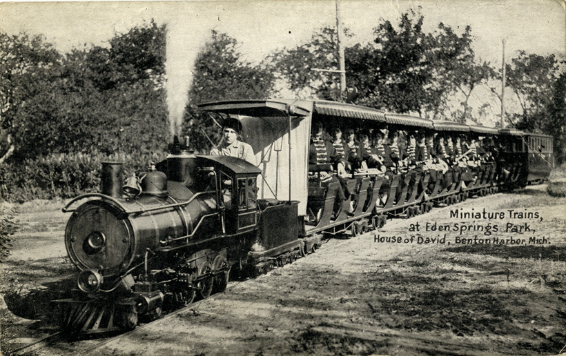 View of musicians posing on miniature train at the House of David Park in Benton Harbor, Michigan. Printed on front: "Miniature trains at Eden Springs Park, House of David, Benton Harbor, Mich." Printed on back: "Eden Springs, House of David, Benton Harbor, Mich. U.S.A. Send for literature to P.O. Box 477."