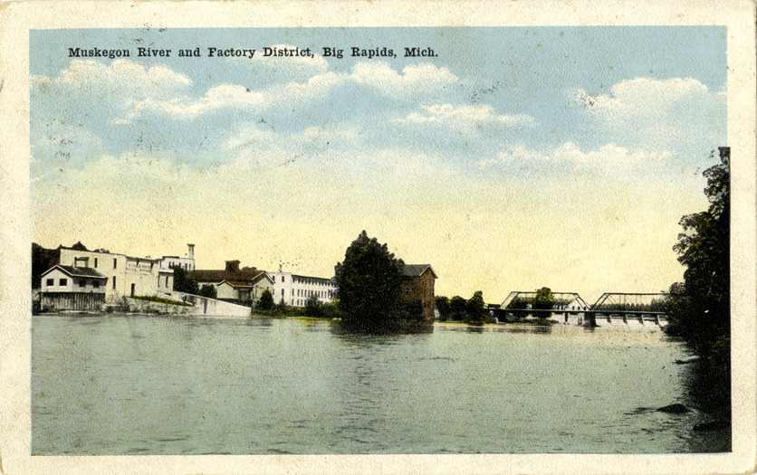 View of factories along the Muskegon River in Big Rapids, Michigan. Truss bridge in background. Printed on front: "Muskegon River and factory district, Big Rapids, Mich." Printed on back: "Pub. by W.A. Stillwell." Undecipherable message handwritten on back. Card is postmarked October 6, 1921.