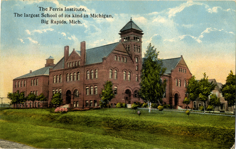 View of the Ferris Institute in Big Rapids, Michigan. Printed on front: "The Ferris Institute, the largest school of its kind in Michigan, Big Rapids, Mich." Printed on back: "Published by Stillwells Bazaar, Big Rapids, Mich. Made in U.S.A. C.T. Photochrom." Handwritten on back: "June 18. Dear Minna: Rec'd your card was surprised to know you were in Detroit. I wrote you girls all a letter and sent it to the store. How are all the girls and your self? I am going away Sunday for a few weeks. Write me at Stanwood. Love, Iva."