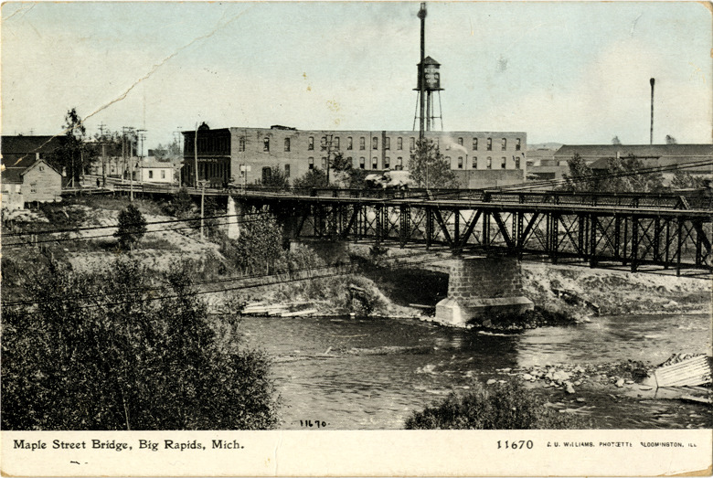 View of the Maple Street Bridge in Big Rapids, Michigan. River in foreground. Printed on front: "Maple Street Bridge, Big Rapids, Mich. 11670, C.U. Williams, photoette, Bloomington, Ill." Handwritten on back: "April 6. Dear Sister, I will not get to come this week but will be there Monday but let me know if Ina is worse will explain when I see you such weather I never saw. Yours in love, Sister E." Card is postmarked April 7, 1911.