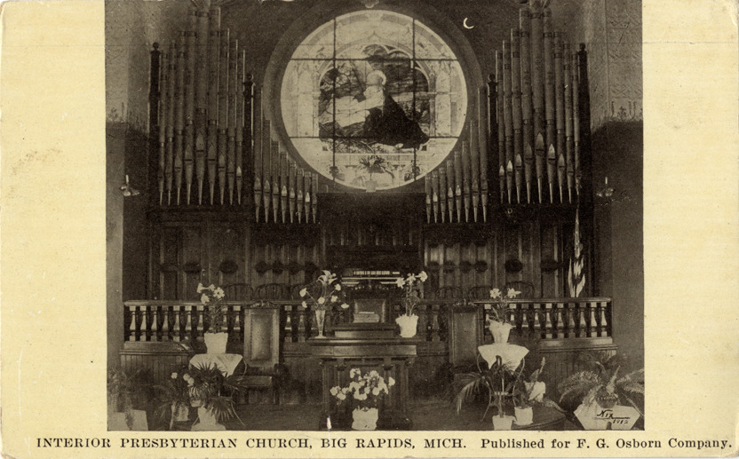 View of the interior of the Presbyterian church in Big Rapids, Michigan, showing the pipe organ. Printed on front: "Interior, Presbyterian church, Big Rapids, Mich. Published for F.G. Osborn [sic] Company." Handwritten on back: "Dear Eltin, All well, your school will soon be out Mama said you were coming up this summer hope you will do better than she is dewing [sic] & come. Is your best man going to the [undecipherable] ha ha tell him no good by write, Aunt Ettie." Card is postmarked May 1, 1914.