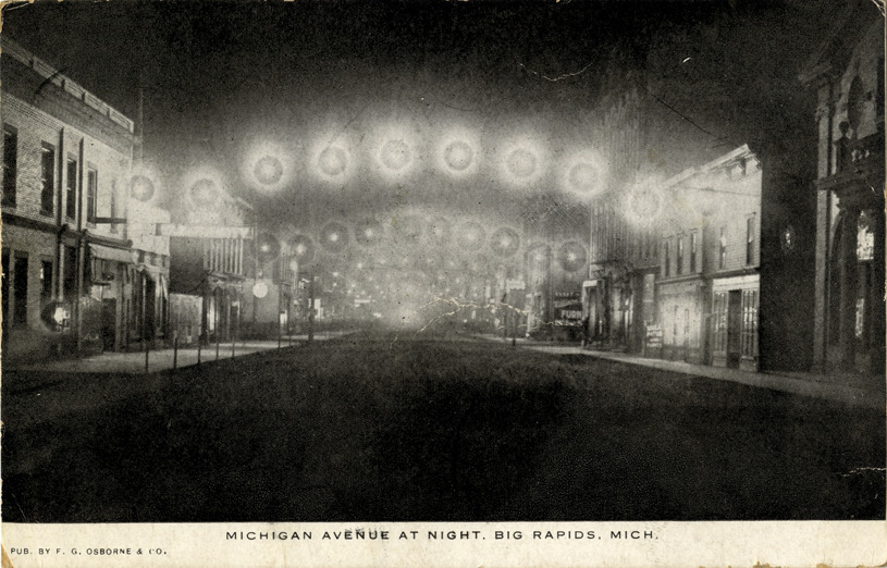 Nighttime view of commercial buildings on Michigan Ave. in Big Rapids, Michigan. Electric lights are suspended over street. Printed on front: "Michigan Avenue at night, Big Rapids, Mich. Pub. by F.G. Osborne & Co." Handwritten on back: "Dear Mamma, I will go to Fenton tomorrow and have a fire already for you. Ethel says it will [undecipherable] maybe you can stay home again for sometime R. can't come so well back it. Ethel feels pretty good, stayed here last night. Ethel."