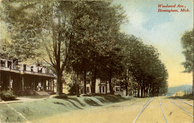 View of houses on tree-lined Woodward Ave. in Birmingham, Michigan. Printed on front: "Woodward Ave., Birmingham, Mich." Printed on back: "Published by Backenstose Bookstore, Pontiac, Mich." Handwritten on back: "Hello everybody, got here O.K.! and everybody is feeling feeling and dandy. Like it out here very much we live out quite aways from the downtown but it is a nice little walk. From Ruth S., Birmingham, Mich." Card is postmarked October 17, 1912.