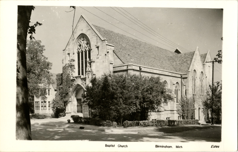 Favorite this☆ Baptist church, Birmingham, Michigan Description: View of the Baptist church in Birmingham, Michigan. Printed on front: "Baptist church, Birmingham, Mich. Estes." Details Resource ID: bh011923 Creator: Estes Subject: Baptist church buildings--Michigan--Birmingham Photographic prints Postcards Date Issued: Unknown year Format: 1 postcard ; 3.5 x 5.5 in. Member of: Burton Historical Collection Filing Location: M/Localities-Birmingham Rights: Physical rights are retained by DPL. Copyright is retained in accordance with U.S. copyright laws.