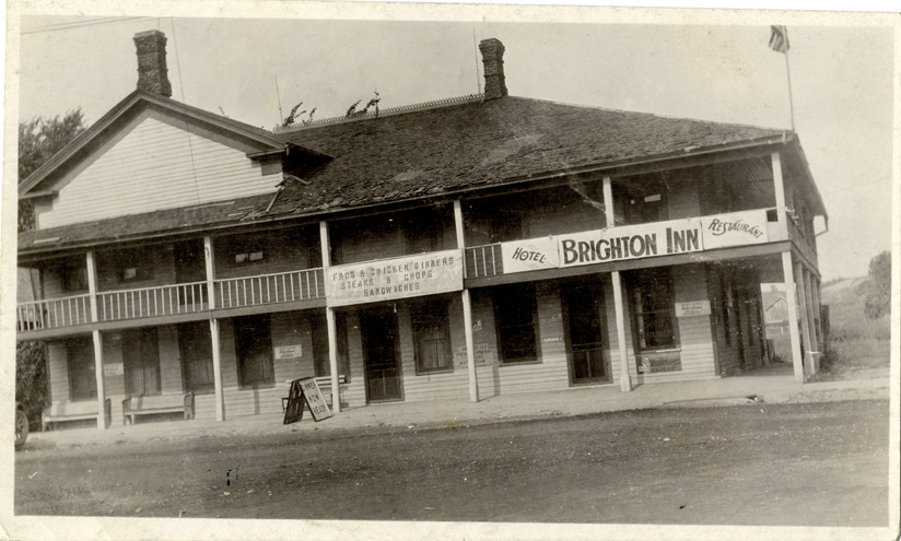 View of the Brighton Inn in Brighton, Michigan. Sign on building reads: "Brighton Inn, hotel, restaurant. Frog & chicken dinners, steaks & chops, sandwiches." Handwritten on back: "Old road house on Grand River Avenue at Brighton. Built in 1841. This picture taken in 1920."