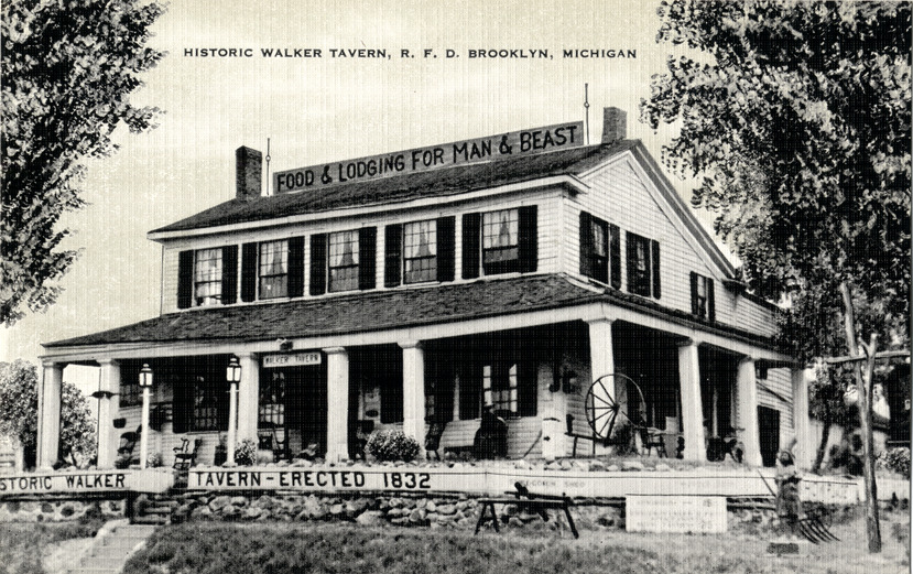 View of the historic Walker Tavern in Brooklyn, Michigan. Printed on front: "Historic Walker Tavern, R.F.D. Brooklyn, Michigan." Printed on back: "46 thrilling rooms. History, drama, murder, antiquity. Oldtime stagecoach. Walker Taverns. R.F.D. Brooklyn, So. Michigan. Irish Hills, U.S. 112 at M50, Hewitt-Antiques. 26 rooms of antiques on sale. Admission 25c. Made in U.S.A. by E.C. Kropp Co., Milwaukee, Wis. (FKA)."