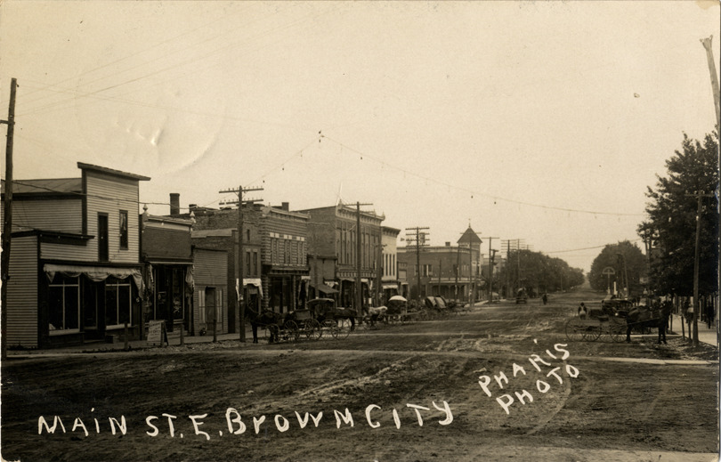 View of commercial buildings and horse-drawn vehicles along Main St. in Brown City, Michigan. Printed on front: "Main St. E. Brown City. Pharis, photo." Handwritten on back: "Mon. a.m. recd your letter this noon. Am going down to C.H. this morning will to to Pt. Huron tomorrow if nothing happens. I wrote [undecipherable] but haven't heard from her so if she don't meet me I will be home. If you could come up to Pt. on the 10, we would meet there and go home at p.m. I can help you make up that time and I can't afford to come up there again this is where Belle worked but has quit Sat. p.m. You can come up now while she is home. In haste, Pearl." Card is postmarked June 6, 1910.