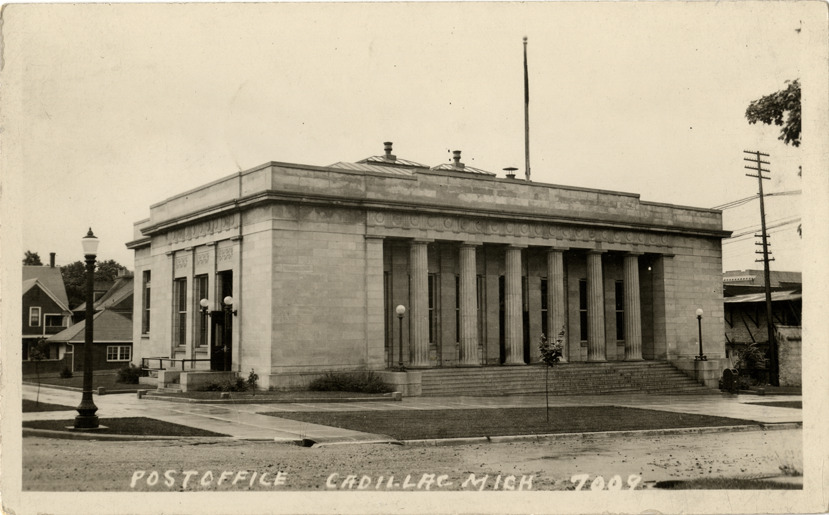 View of the U.S. Post Office in Cadillac, Michigan. Printed on front: "Post Office, Cadillac, Mich. 7009." Handwritten on back: "November 30, 1926. Dear Cousins, Rec'd your good letter. Was glad to hear. We close for vacation on the 17th for two weeks. I think you may see me but I was at Muskegon Thanksgiving Day and Ethel [undecipherable] me to return and spend vacation with her but I did not promise her. I thank you so much and may stay with you a part of the time. Hard to decide now what to do. Ruth Robins."