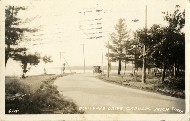 Distant view of a car traveling on Boulevard Dr. in Cadillac, Michigan. Printed on front: "Boulevard Drive, Cadillac, Mich. Clark." Handwritten on back: "Dear Cousins, I had good luck. Enjoy my new room & home, also the pupils are very pleasing. Cadillac is so pretty now. Wish much to show it to you while it is green & many flowers. My longest trip was to Detroit. Will tell more about it when I see you. George Robins came and he is a very nice man. We enjoyed seeing him. I am quite well and went to this fair yesterday & drew a heavy blanket for 30 cts. Luck games & gambling, ha!" Card is postmarked September 1926.
