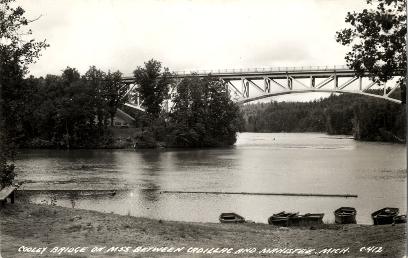 Favorite this☆ Cooley Bridge on M-55, Michigan Description: View of the Cooley Bridge on M-55 between Cadillac and Manistee, Michigan. River and rowboats in foreground. Printed on front: "Cooley Bridge on M55 between Cadillac and Manistee, Mich. C-412." Details Resource ID: bh012082 Subject: Bridges--Michigan Rivers--Michigan Boats and boating--Michigan Photographic prints Postcards Date Issued: Unknown year Format: 1 postcard ; 3.5 x 5.5 in. Member of: Burton Historical Collection Filing Location: M/Localities-Cadillac Rights: Physical rights are retained by DPL. Copyright is retained in accordance with U.S. copyright laws.
