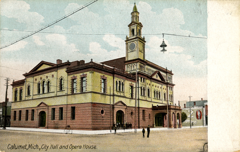View of the City Hall and Opera House in Calumet, Michigan. Printed on front: "Calumet, Mich., City Hall and Opera House." Printed on back: "The Hugh C. Leighton Co., manufacturers, Portland, Me., U.S.A. Printed in Frankfort o/Main. Germany no. 4822."