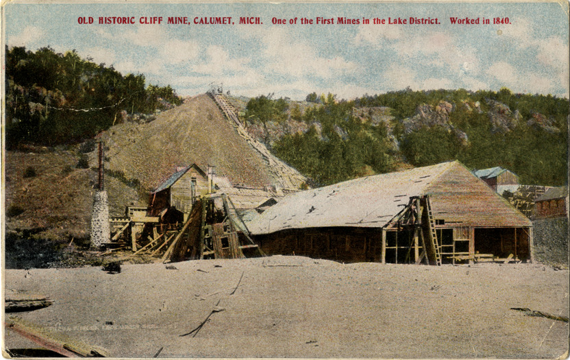 View of the Cliff Mine in Calumet, Michigan. Printed on front: "Old historic Cliff Mine, Calumet, Mich. One of the first mines in the Lake District. Worked in 1840." Printed on back: "Pub. by F.R. Vigeant & Bro., Yellow Front Curio Store, Houghton, Mich." Handwritten on back: "Won't be home for another week. How about it. Harry. c/o M. Harrison, Tamarack, Calumet, Mich." Card is postmarked September 7, 1910.