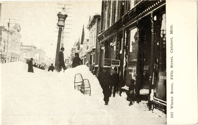 View of several boys playing on snowbanks next to commercial buildings on Fifth Street after a winter storm in Calumet, Michigan. Printed on front: "1917. Winter scene, Fifth Street, Calumet, Mich." Printed on back: "Pearson-Ullberg Co., Minneapolis."