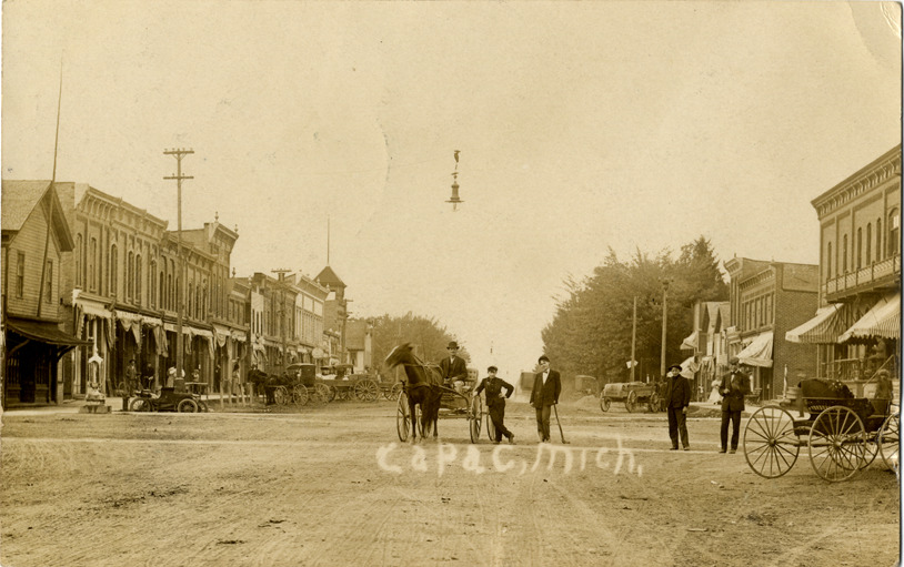 View of several men posing in street with horse-drawn carriage, Capac, Michigan. Commercial buildings in background. Printed on front: "Capac, Mich." Stamped on back: "E. Schook, photographer, Capac, Mich." Handwritten on back: "We arrived safe & sound. Say Geo. I believe I left my black comb & if Mrs. W. or ur mother comes up here will u send it? Please. Don't forget that I live at Capac. Nina Savage." Card is postmarked September 7, 1907.