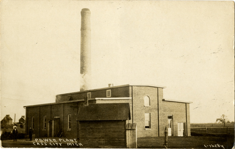 View of the power plant in Cass City, Michigan. Printed on front: "Power plant, Cass City, Mich." Handwritten on back: "I put all the mancherny [machinery?] in this plant and moved it. I got a raise on my job Wed. to 110 per hour and some overtime then [undecipherable] to go on the road. Write me at Nashville, Tenn. [undecipherable] the Fair Ass; write me afought [after?] the 20 and I get it I am only 1 week in a place you know if you car [sic] to write me please do for one old love and friendship. Your old pal, Jacob C. Anthes."