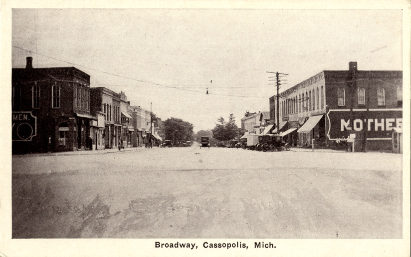 Favorite this☆ Broadway Street, Cassopolis, Michigan Description: View of commercial buildings and automobiles along Broadway St. in Cassopolis, Michigan. Printed on front: "Broadway, Cassopolis, Mich." Printed on back: "Auburn Post Card Manufacturing Co., Auburn, Indiana." Details Resource ID: bh012196 Subject: Streets--Michigan--Cassopolis Commercial buildings--Michigan--Cassopolis Postcards Publisher: Auburn Post Card Manufacturing Co. Date Issued: Unknown year Format: 1 postcard ; 3.5 x 5.5 in. Member of: Burton Historical Collection Filing Location: M/Localities-Cassopolis Rights: Physical rights are retained by DPL. Copyright is retained in accordance with U.S. copyright laws.