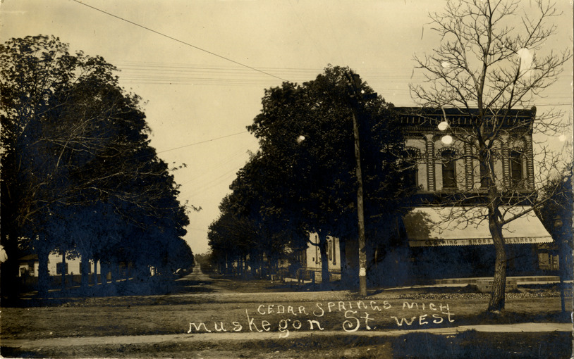 View of tree-lined Muskegon St. in Cedar Springs, Michigan. Clothing, shoe and millinery store on corner. Printed on front: "Cedar Springs, Mich. Muskegon St. West." Handwritten on back: "This is the corner in town where we turn west to come home we live two miles and a quarter straight west on this road."